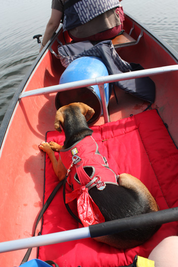 Ganz einfach : An einer engen Stelle konnte sie sich nicht beherrschen, ist vom Boot ans steile Ufer gesprungen und abgehauen ! Also mußte ich sie wieder einfangen und an einer nicht ganz so steilen Stelle wieder in Boot heben. |